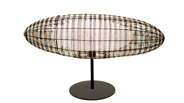 Table lamp made of buri midrib, metal frame, nylon, and fibreglass. Power supply: 120V 60HZ/ 230V 50hz. Lamped with 1 E27 bulb. Colour available: black